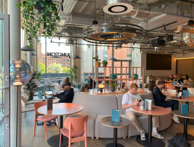 Junction at Manchester Central welcomes laptop users to its spacious, calm cafe-bar and social workspace. There’s no daily or hourly rate for coworking – just buy a drink and some food every now and then and you’ll be fine. The menu prices are very reasonable, meaning you can easily stay here all day for under £20, which is about the standard rate for co-working. (And you’ll get to enjoy fresh, chef-cooked food and barista-made coffee as part of it). With fast wifi, powerpoints, booths, and window and table seating, it’s got everything you need for a productive day.