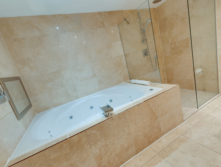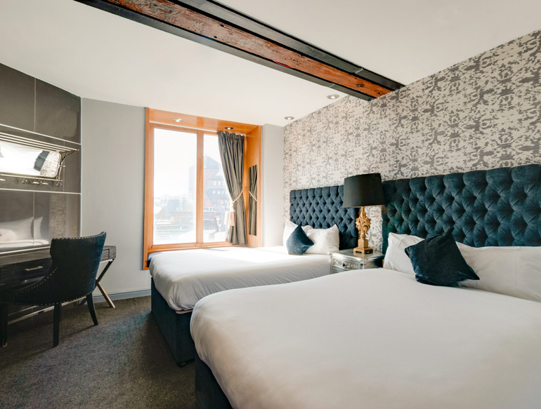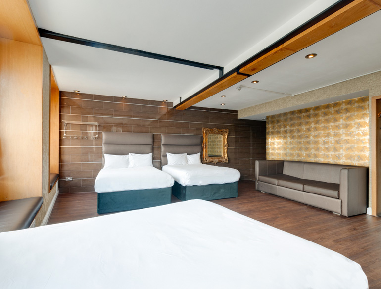 Décor is a slightly odd mix of luxe materials and leather upholstery combined with a bit of a dormitory feel. Having said that, as rooms packed out with loads of double beds go, they’re some of the better ones. Also, the location is spot-on and the facilities are good with a hot tub, baggage storage, 24-hour front desk, airport transfers, a concierge service, Smart TVs and free wifi.