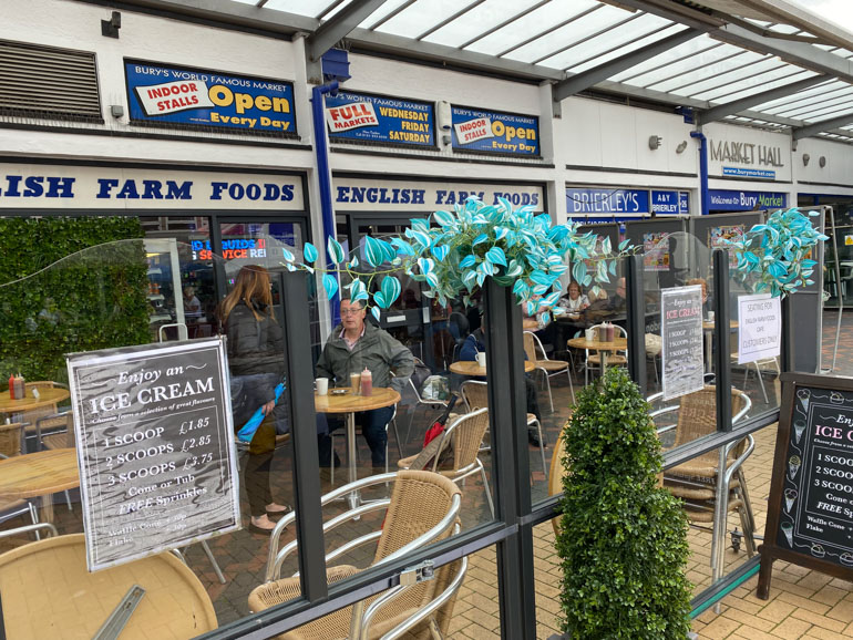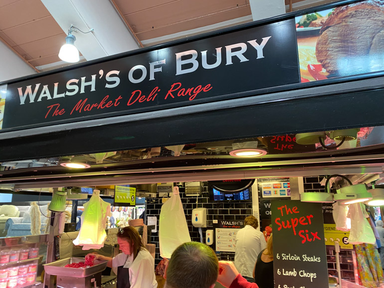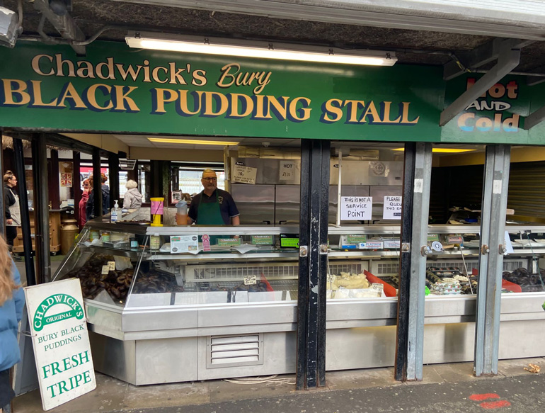 The entrance to Bury Market from the car park side is rather theatrical. There’s usually an accordion player ringing out traditional ditties that echo through the subway as you pass under the main road. It then becomes much more grand, ascending under the wrought iron gateway with the traditional ‘Bury Market’ welcoming sign.