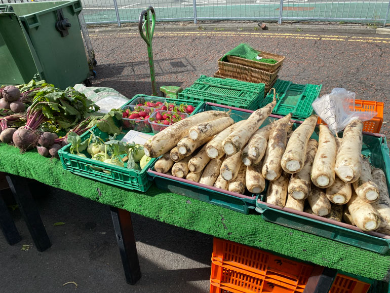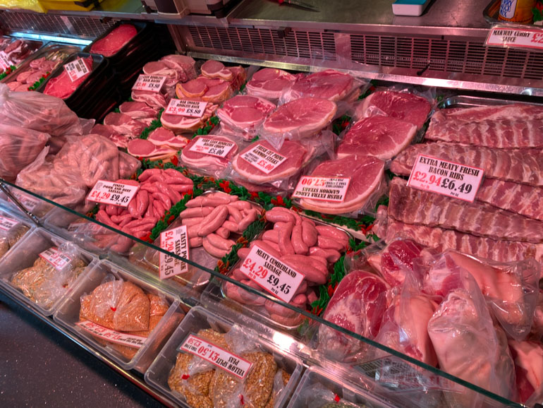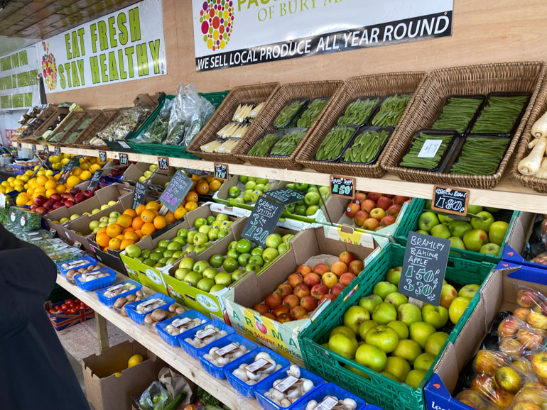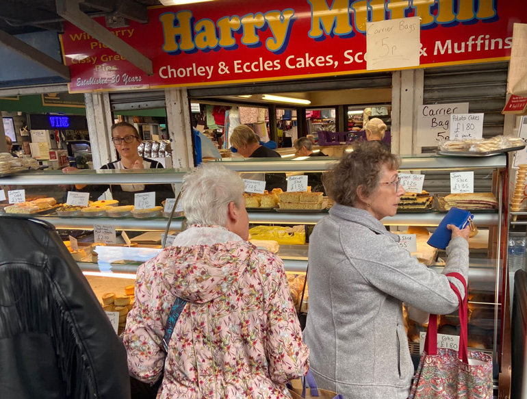 Leave the hall to explore Iddon’s fruit and veg. This is the place to go for larger fruit and veg requirements. It’s heaving after 10am so, if you want to do your weekly shop there, it’s advisable to arrive soon after the market opens at 9am. Pete’s Fruit and Veg is opposite and well worth a look around with rarities such as fresh tumeric, cook-at-home black peas and a selection of nuts. Pete’s has the glorious conveyor belt system where you start at one end, work your way round the store in a single file lane and then pay at the end. This is how all local village markets used to be laid out and it certainly has a nostalgia trip.