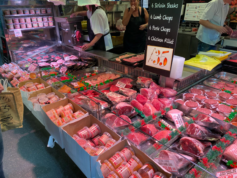 Come back towards the centre through the Fish and Meat Hall. This is the place to go for large whole chickens, seafood and big joints of meat. There’s some beautifully crafted chicken Kievs that are ready to go straight in the oven.