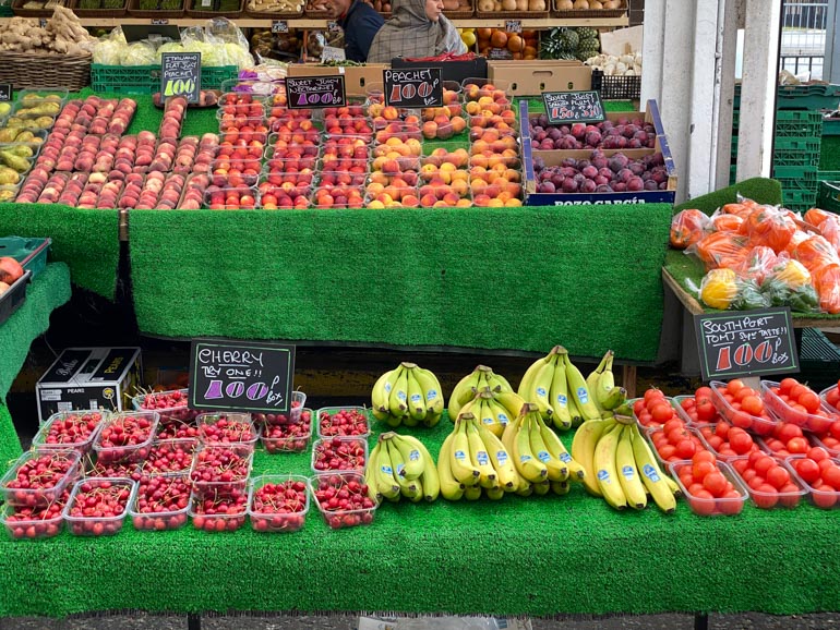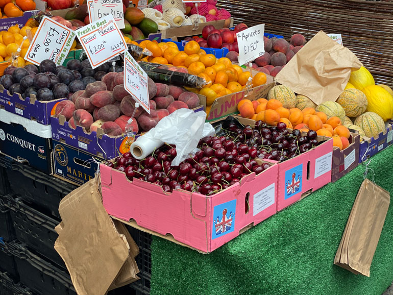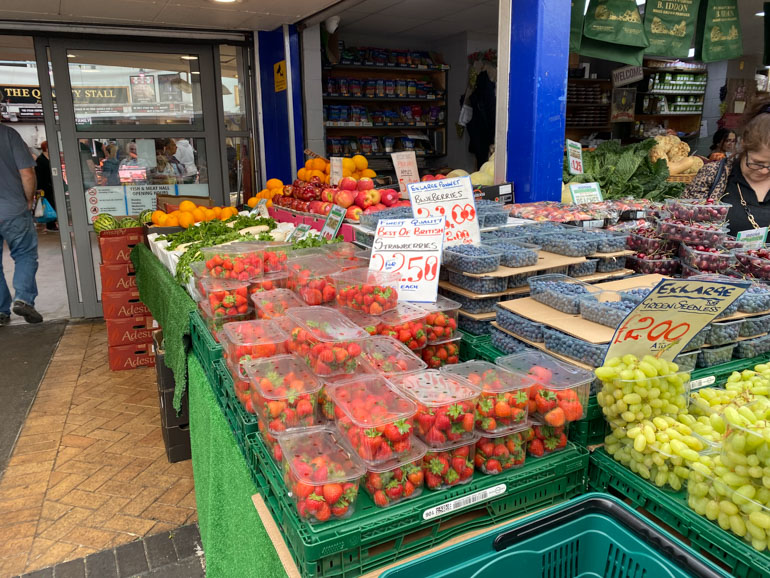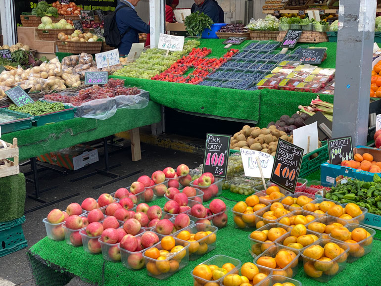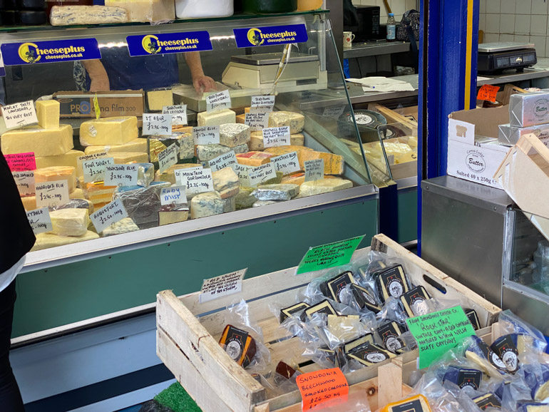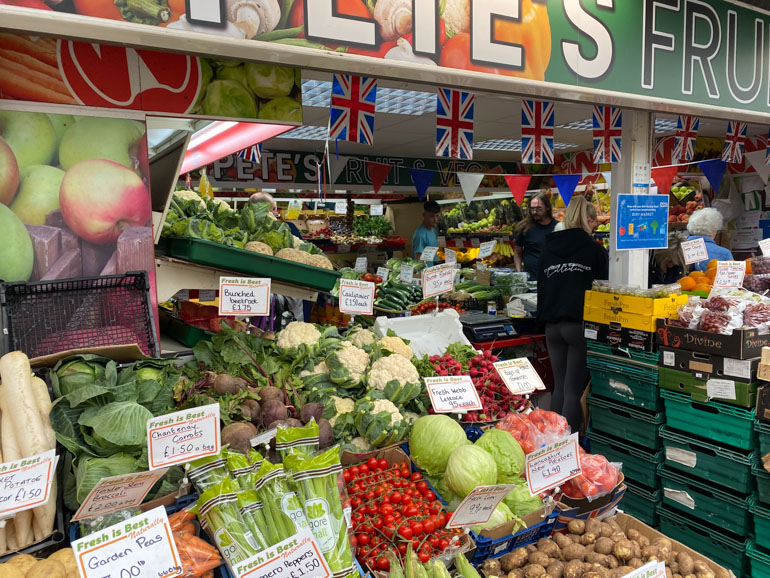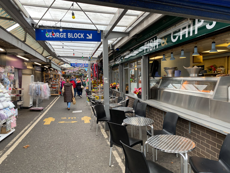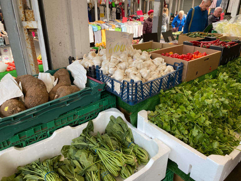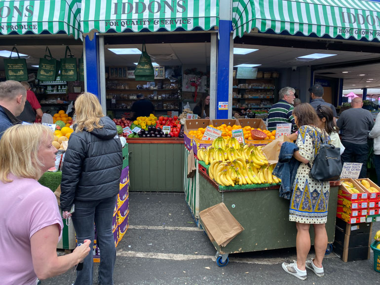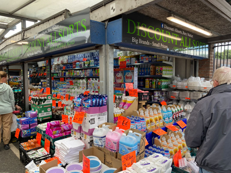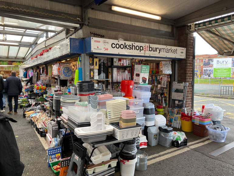 Next to the entrance is the Hot Potatoes wagon. It’s been there for at least 40 years, selling bags of hot baby potatoes as snacks. They’re an excellent choice on a drizzly cold day. They also have jacket potatoes with a range of fillings and other treats such as a cup of black peas. These are northern tradition, usually eaten on 5 November as part of Guy Fawkes Night celebrations with bonfires and fireworks, but whenever you have them, you need to add a glug of malt vinegar. It’s cash only as are a lot of the smaller stalls so make sure to bring change as well as your shopping bags.