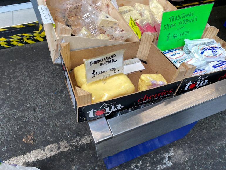 Passing round the other end of the Toulmin Block is Cheeseplus with a range of traditional county cheeses as well as different flavour combination including Guiness, lemon and black pepper. They also have free samples to try and they sell huge chunks of real butter. Just remember to measure your butter dish before grabbing a butter brick.